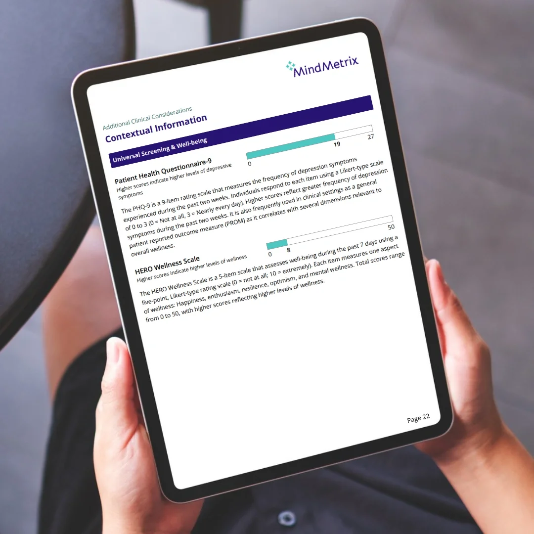 The PHQ-9 is a widely accepted, validated tool. It provides a reliable lens into a patient’s overall mental health over time. By including it as contextual information in every assessment, MindMetrix gives clinicians a consistent, reliable measure to: